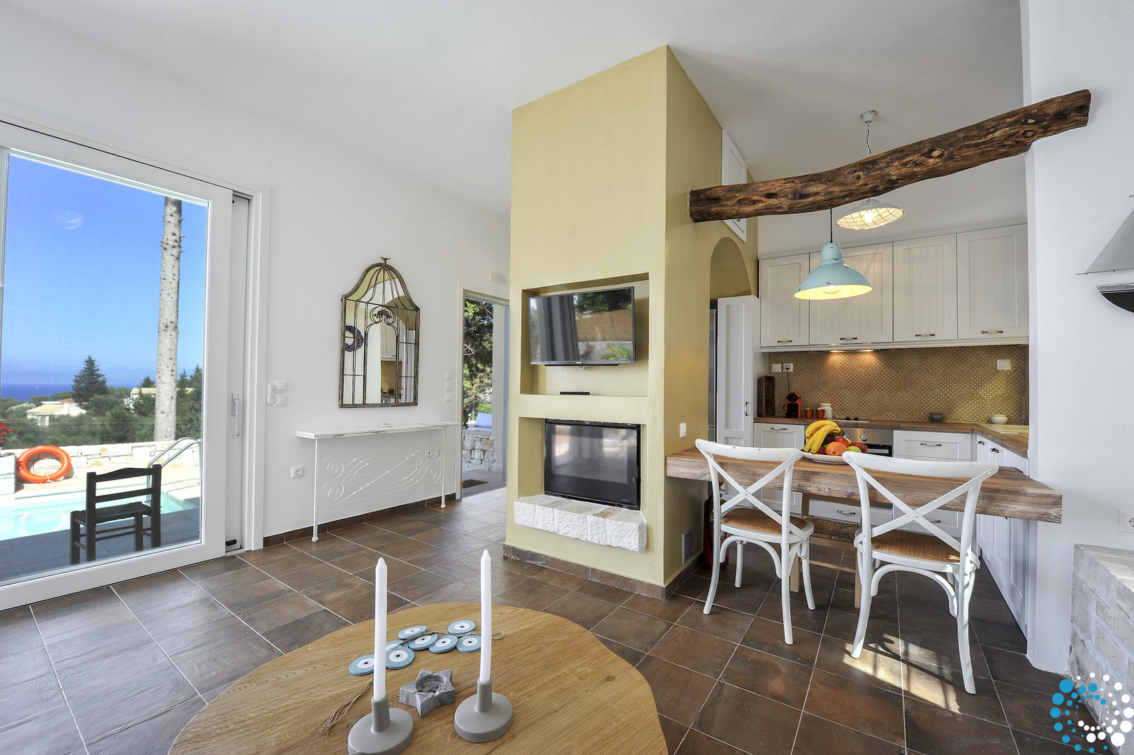 Each villa has two floors. Ground floor comprises of the living room, the kitchen and the first double bedroom with en-suite bathroom. This bedroom consists of two single COCOMAT mattresses that can be brought together. Going up the stairs, the second double bedroom with en-suite bathroom can be found. This second bedroom has a double COCOMAT mattress. A large balcony on the 1st floor oversees the Ionian Pelago. The living room has a large built sofa which can accommodate a fifth person. The living room and the two bedrooms are equipped with inverter A/C units while the two bedrooms also have ceiling fans. The living room has a fireplace as well as a TV.