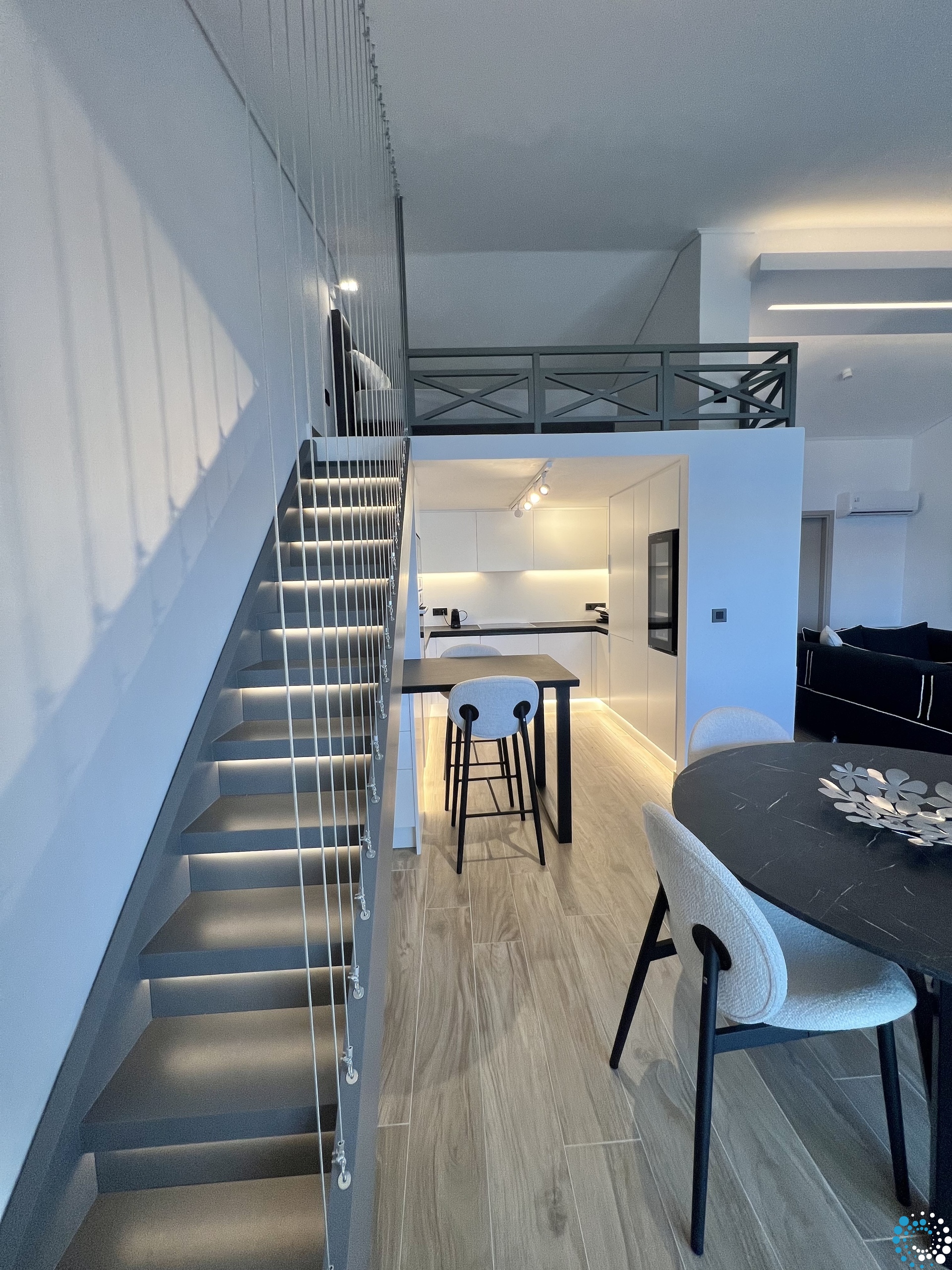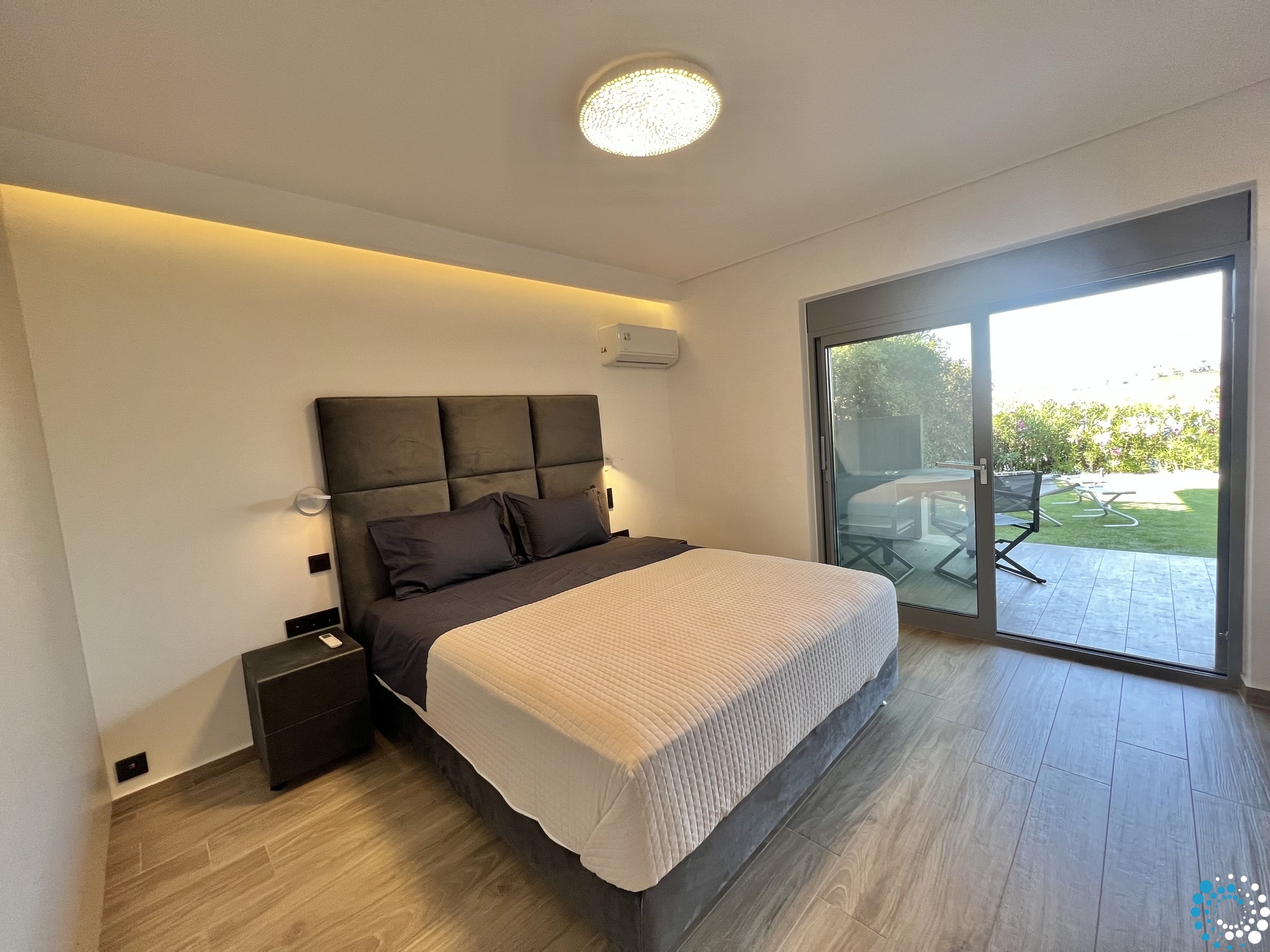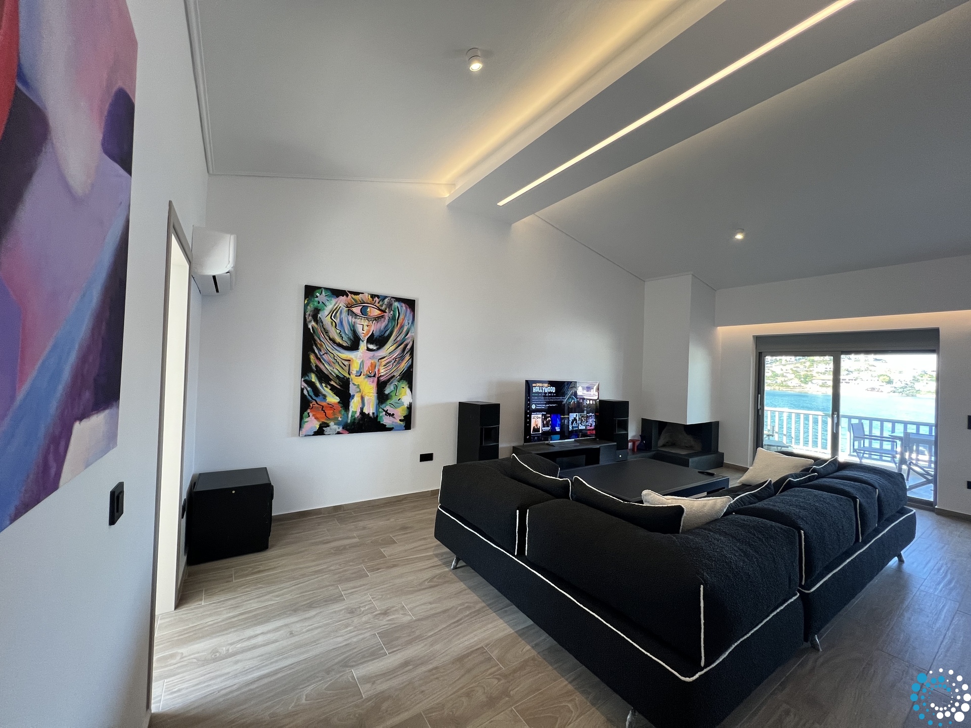 The maisonette has 4 spacious bedrooms, 3 bathrooms, two kitchens, a large balcony with a panoramic sea view, a large front yard with a huge spa for 5 persons, and a back yard. All these areas have 3 different expandable dining tables and chairs with a capacity of 12 persons each.