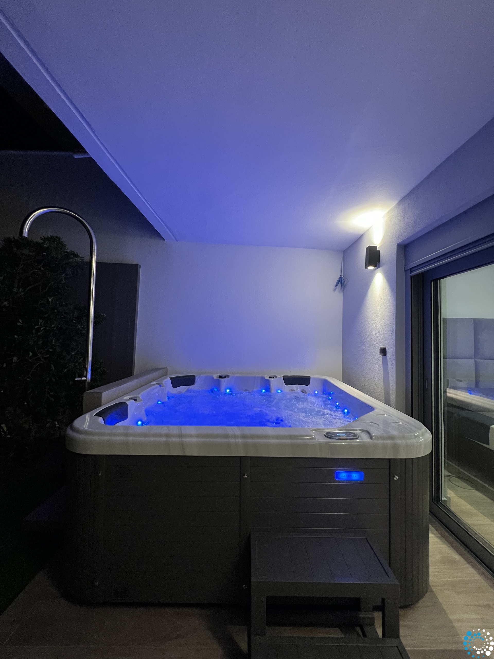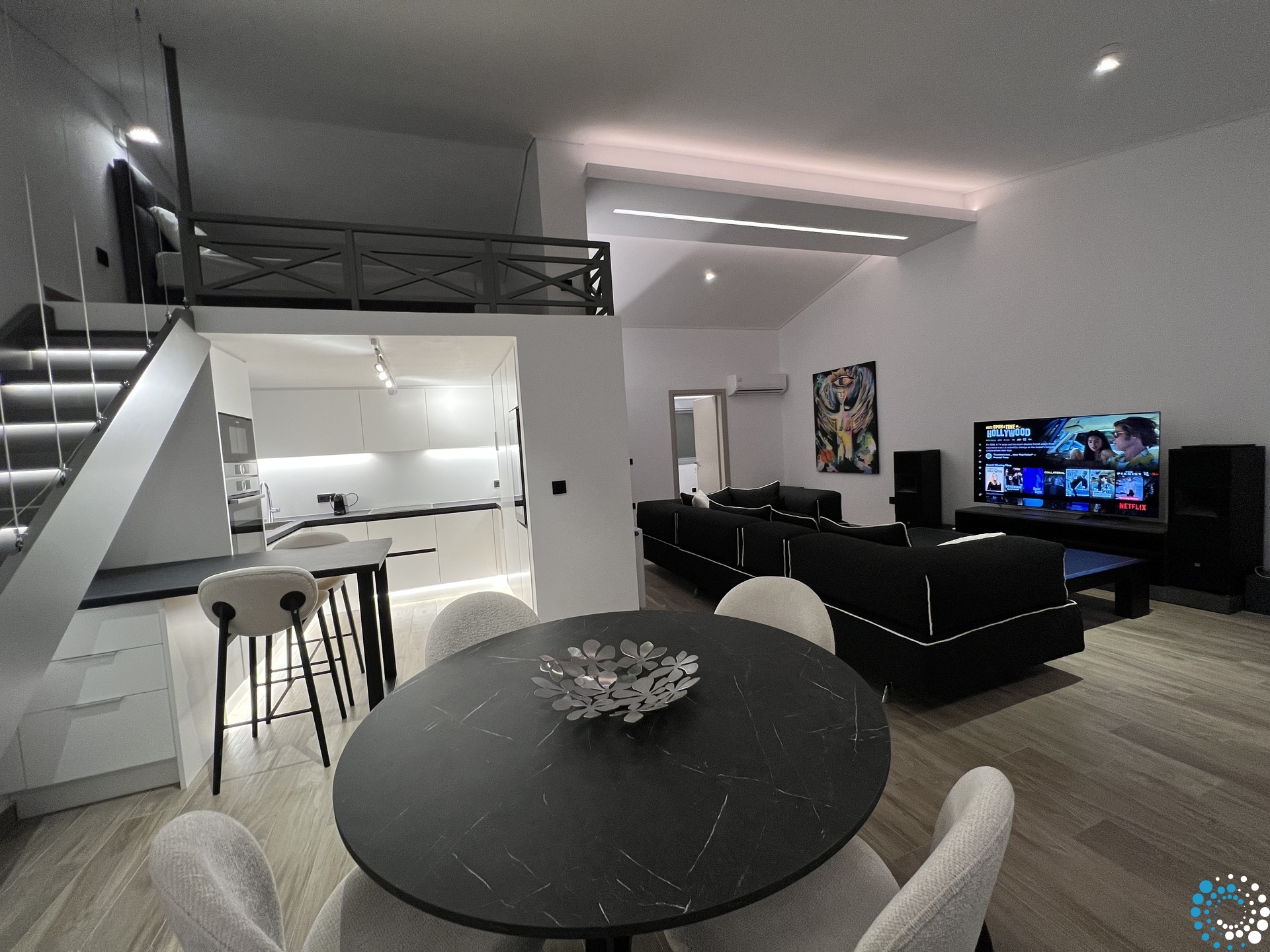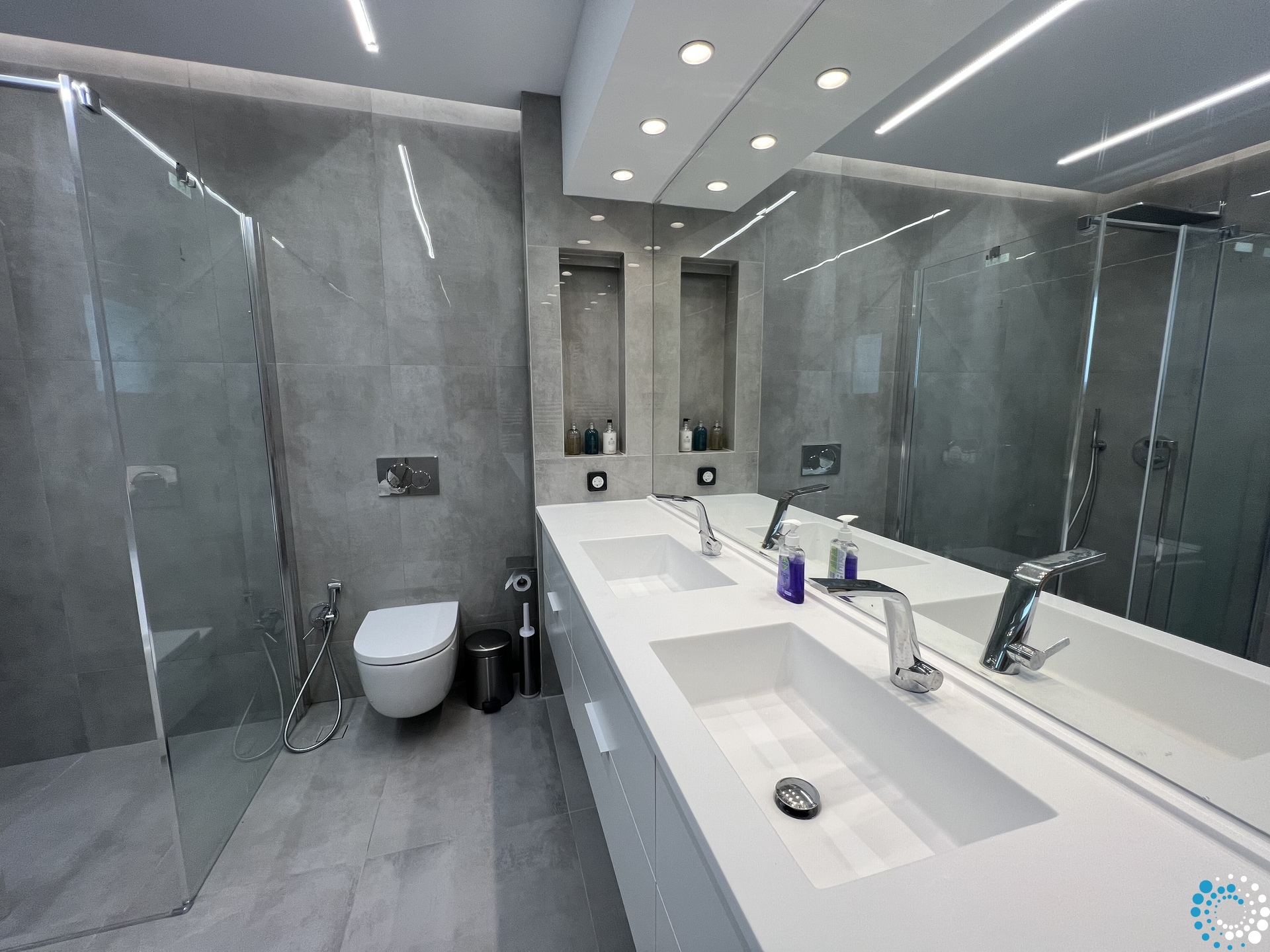 The maisonette has 4 spacious bedrooms, 3 bathrooms, two kitchens, a large balcony with a panoramic sea view, a large front yard with a huge spa for 5 persons, and a back yard. All these areas have 3 different expandable dining tables and chairs with a capacity of 12 persons each.