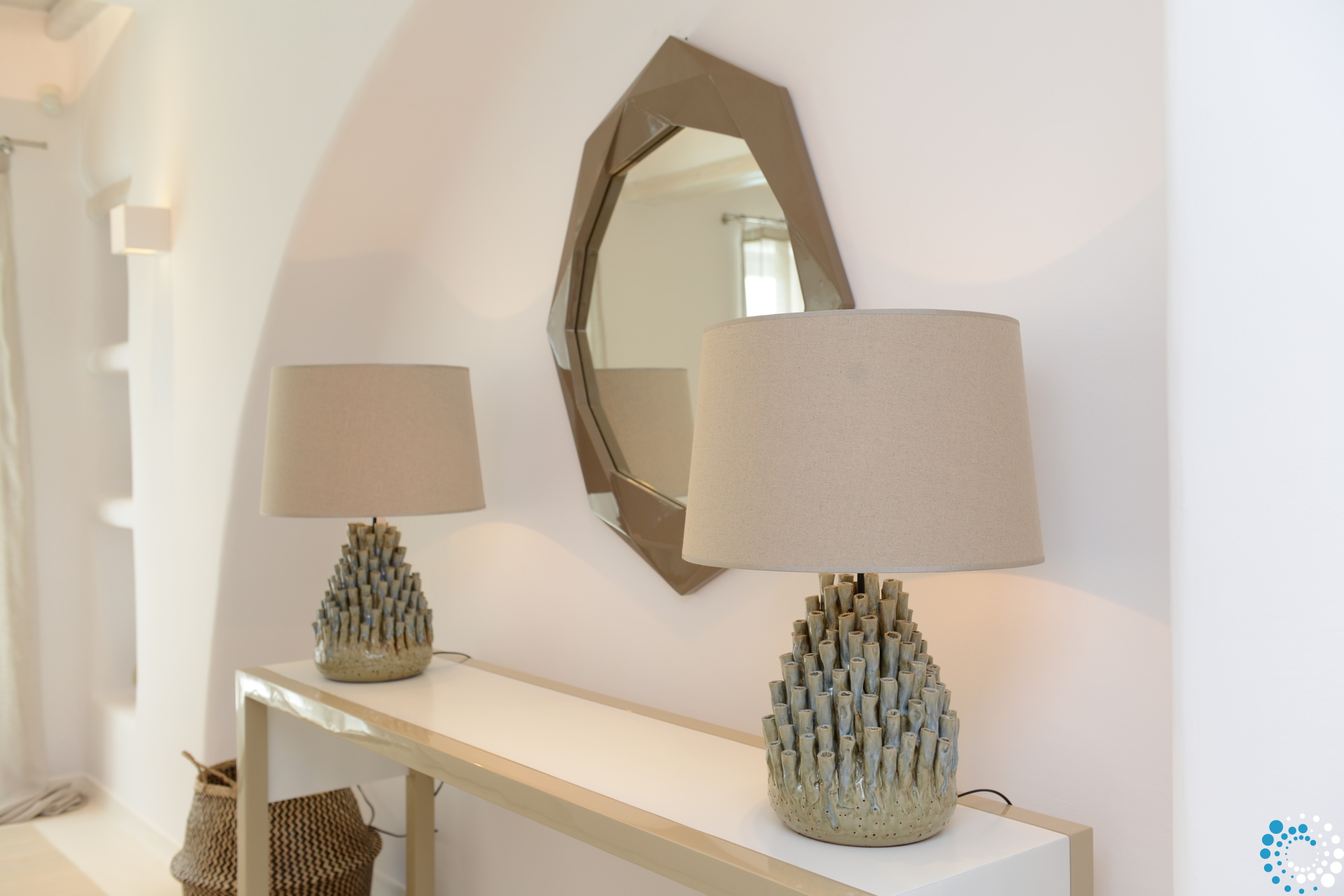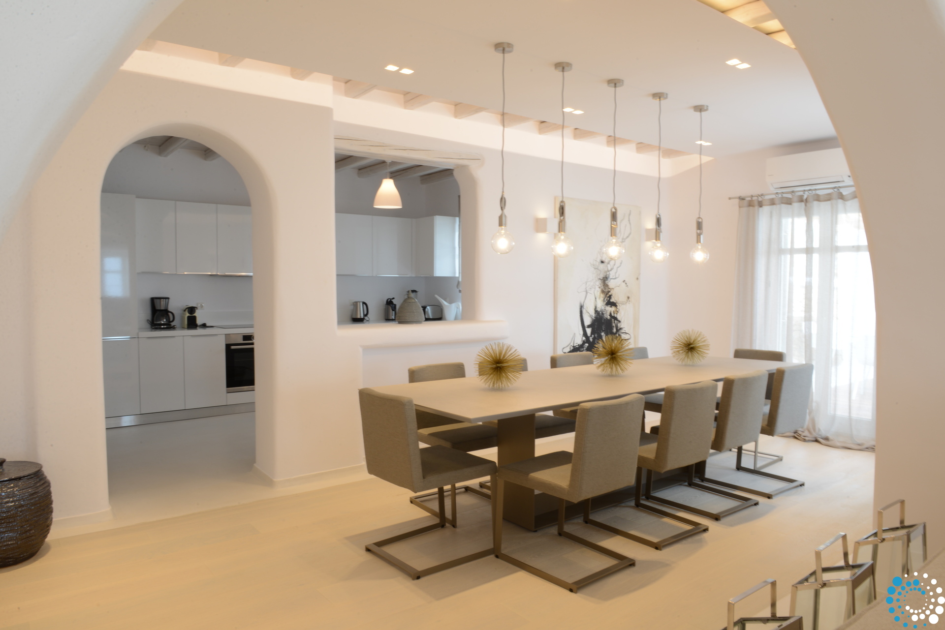 The minimal decor with elegant furniture provides a timeless style to this luxury Villa. Villa Orelie, makes a great match for guests who appreciate exquisite taste, while being close to Mykonos Town. The spacious living room (with fireplace) and dining room are close to the kitchen, which is equipped with all modern appliances. Mykonos Villa Orelie features full air conditioning in all main interior areas, WIFI, TV and alarm system.