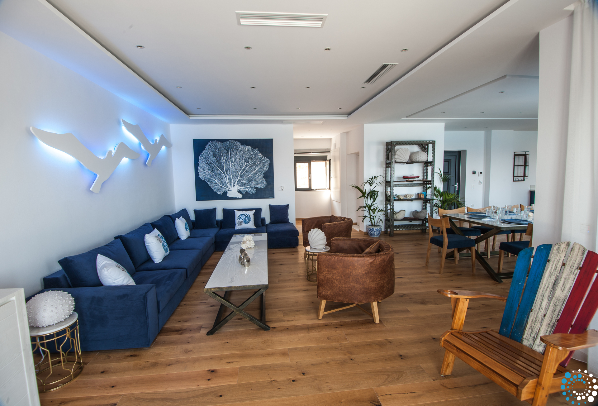 Italian hardwood floors run the length of the large open plan kitchen and living area. Deluxe handpicked furnishings, modern art, and a top-of-the-range kitchen, in what we can only describe as Aegean blue.