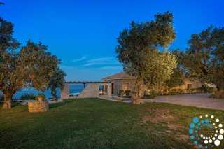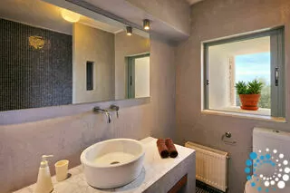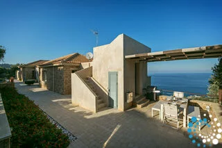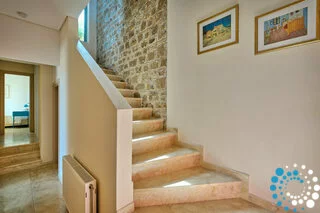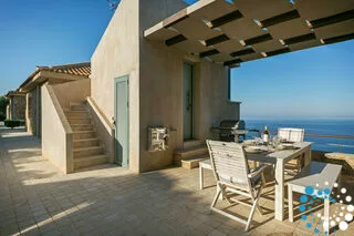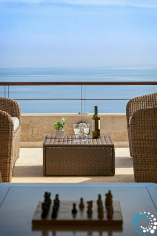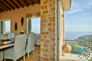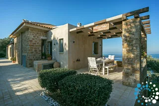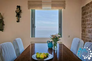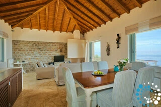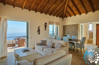 The spacious living room, built of stone, has a comfortable sitting area with unique pieces of wood furniture and selected textiles, large windows for the guest to enjoy the stunning sea view, and to relax, a design dining table, Plasma TV, and comfortable armchairs. A central heating system is also available in case you visit the houses in the winter.