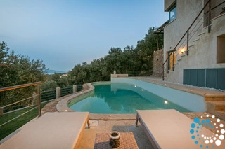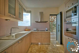 The villa built in a contemporary architectural style, is comfortable, sunny and spacious with stone walls and wooden beams on the ceilings.