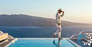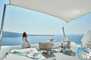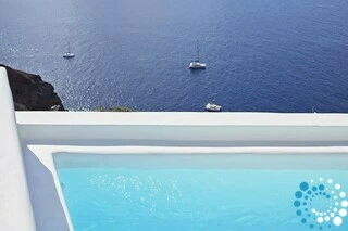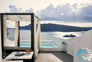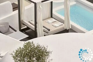 La suite fait partie d’un hôtel de luxe proposant des hébergements de style cycladique avec terrasses surplombant la caldeira et la mer Égée. Les clients peuvent profiter du soleil au bord de la piscine à débordement, où la vue panoramique sur la caldeira et les couchers de soleil inoubliables créent un cadre véritablement magique.