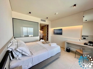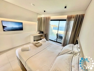 L’intérieur baigné de lumière et les tons chaleureux, combinés à la vue impressionnante sur la mer, créent une atmosphère relaxante propice à des souvenirs inoubliables. Les éléments naturels présents dans la chambre offrent un cadre apaisant pour vous reconnecter avec vous-même. Ouvrez les portes de la terrasse menant à votre piscine d’eau de mer privée. Laissez la lumière du soleil caresser votre corps pendant que vous vous détendez sur votre transat et admirez la vue à couper le souffle.