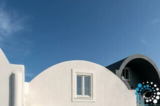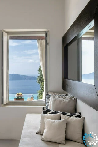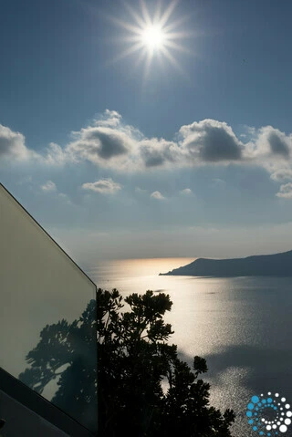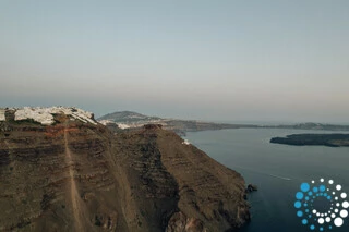 Ici, les formations rocheuses volcaniques, la mer azur, les nuances de la caldeira, la douce brise marine et la lumière radieuse du soleil grec—d’ouest en est—coexistent harmonieusement avec l’environnement naturel.