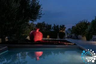 L’eau est la marque de l’hôtel, qui se déploie à chaque pas dans l’enceinte. Des lacs-piscines, des jacuzzis et des canaux fluents guident les invités depuis le parking jusqu’à la réception, puis vers les suites. Du lever au coucher du soleil, les bleus du ciel, de la mer et des éléments aquatiques vous entourent et vous immergent.