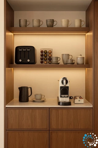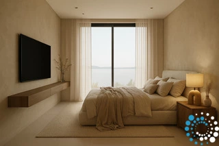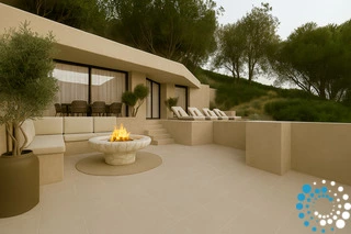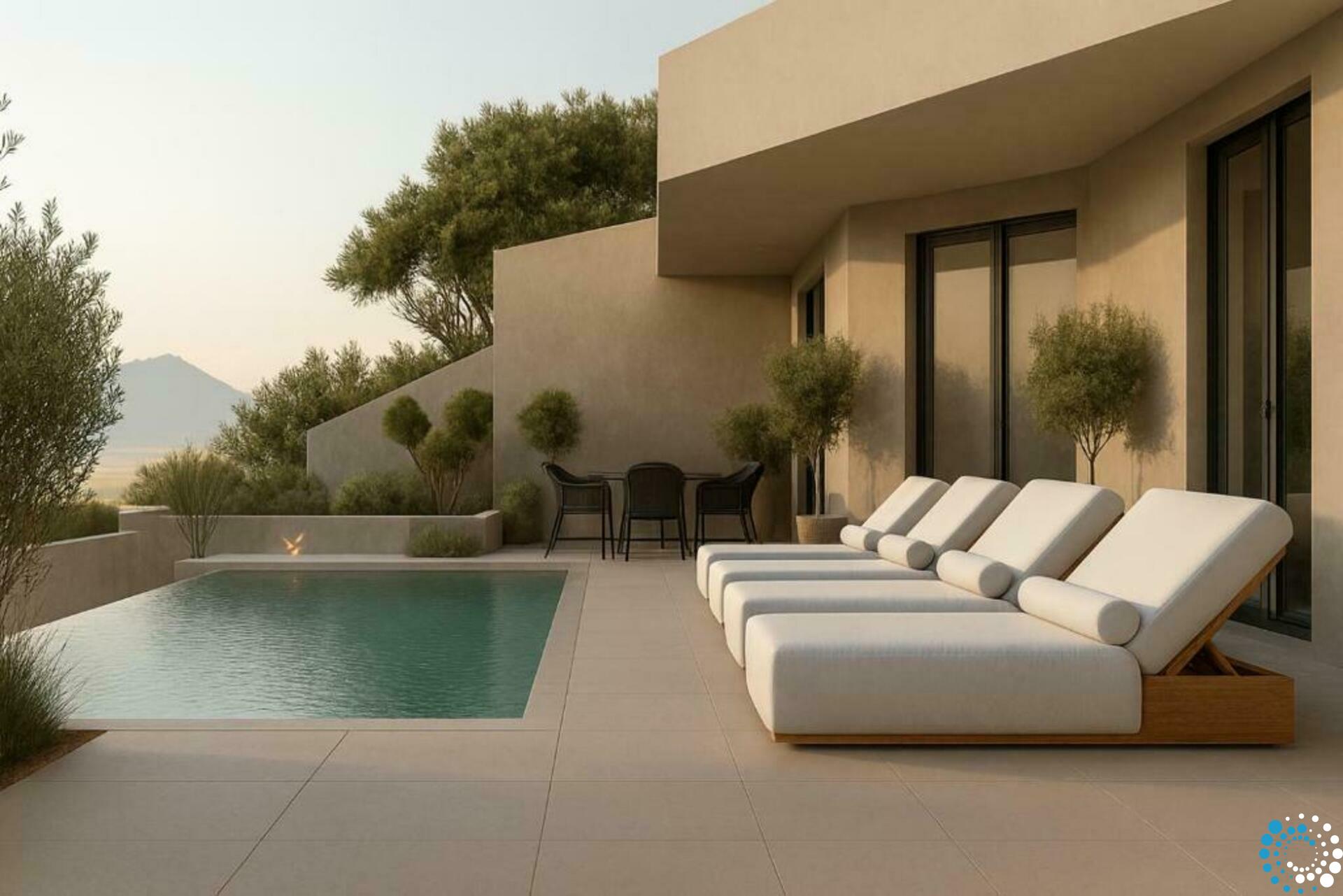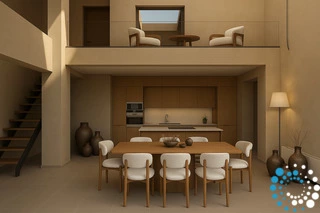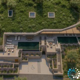 Les toits végétalisés plantés de flore locale augmentent la biodiversité, tandis que la construction intégrée à la terre permet aux villas de se fondre naturellement dans le paysage, offrant une excellente isolation naturelle et une efficacité énergétique. La durabilité est au cœur de chaque détail : les intérieurs sont finis avec un enduit naturel favorisant une qualité de l’air intérieur saine, et seuls des matériaux naturels, dont le bois massif, sont utilisés, sans revêtements synthétiques, afin de réduire l’empreinte écologique. Un ascenseur partagé permet un accès facile et adapté aux fauteuils roulants de l’entrée aux deux villas.
