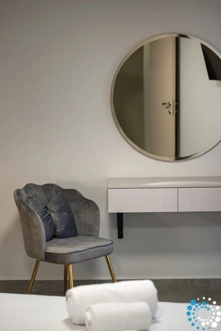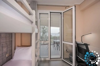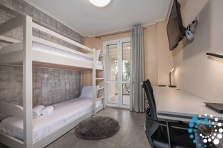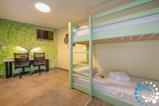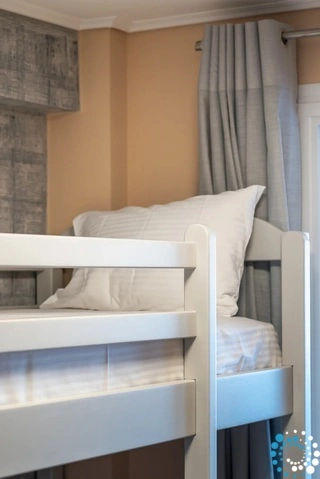 Le premier étage comprend deux élégantes chambres doubles, chacune soigneusement aménagée avec une armoire, une télévision et une coiffeuse stylée avec miroir et chaise. De plus, il y a deux chambres confortables avec lits superposés, idéales pour les familles ou les groupes, chacune équipée d’un bureau pour deux personnes afin de travailler ou d’étudier. Un petit local de rangement pratique abrite les produits de nettoyage et un lave-linge, complété par deux WC modernes.