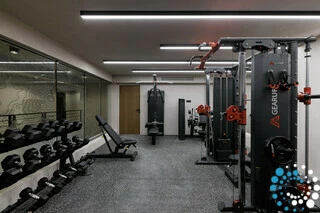 The middle level includes a fully equipped gym (31 sqm), adding a wellness dimension to the villa experience.