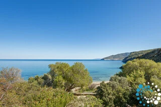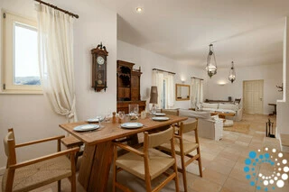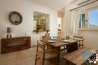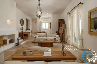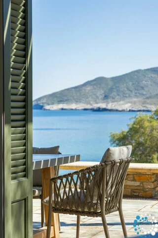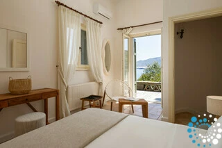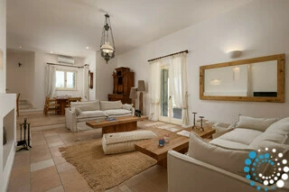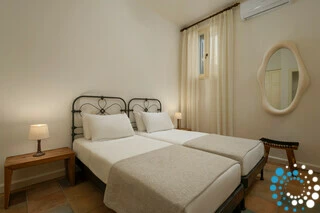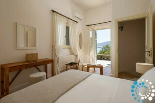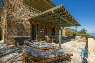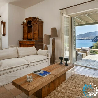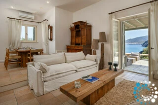 De grandes baies vitrées et des espaces de vie ouverts donnent accès à une vaste terrasse et un balcon surplombant la mer Égée, offrant une vue imprenable et un cadre parfait pour un café au lever du soleil ou des moments conviviaux au coucher du soleil. À quelques pas du rivage, les visiteurs profitent d’un accès direct à la plage et du bruit apaisant des vagues tout au long de leur séjour.