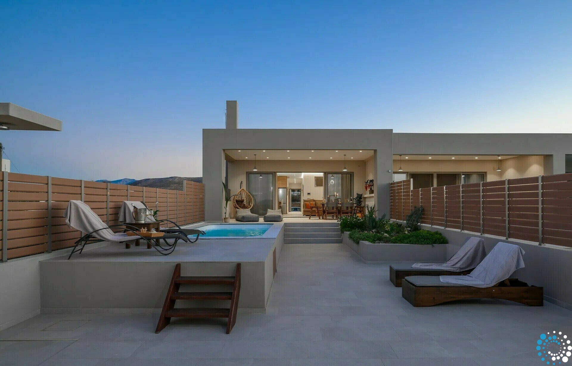 À l’extérieur, votre oasis privée vous attend avec une piscine chauffée. Le vaste espace extérieur comprend de confortables transats et chaises longues, une grande table à manger pour des repas en plein air, ainsi qu’une douche extérieure — parfaite pour se rafraîchir sous le soleil.