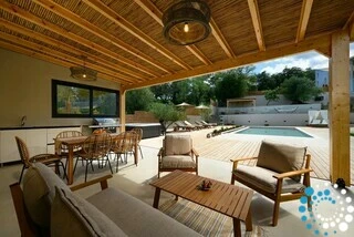 Au niveau inférieur, Villa Eikona révèle un espace de divertissement unique conçu pour la détente et les loisirs. Cet espace polyvalent comprend un grand salon TV et un canapé-lit confortable, idéal pour des soirées détendues, des moments en famille ou des instants conviviaux.