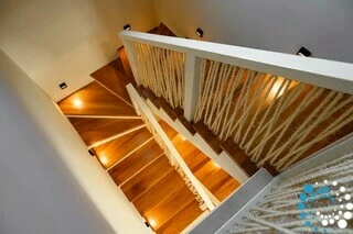 Au premier étage, deux chambres magnifiquement aménagées avec salles de bain privatives et lits king-size s’ouvrent sur des vues paisibles de la piscine et des jardins paysagers. L’une des salles de bain dispose d’une baignoire relaxante, tandis que l’autre est équipée d’une douche moderne, offrant différentes options de confort.