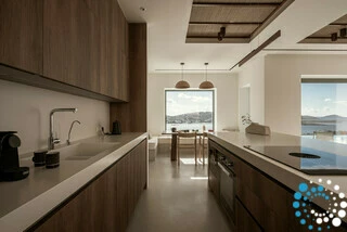Au cœur de la maison se trouve un espace de vie ouvert et lumineux qui réunit cuisine, salle à manger et salon dans un lieu convivial. Une grande table à manger pour huit personnes accueille les repas partagés, tandis que la cuisine contemporaine est entièrement équipée avec un îlot central, une plaque Bora, un four et un micro-ondes intégrés, ainsi qu’une machine Nespresso pour les matins paisibles de l’île. Le salon, encadré de grandes baies vitrées avec vue sur la baie, comprend une cheminée, une grande télévision et une atmosphère détendue qui relie naturellement intérieur et extérieur.