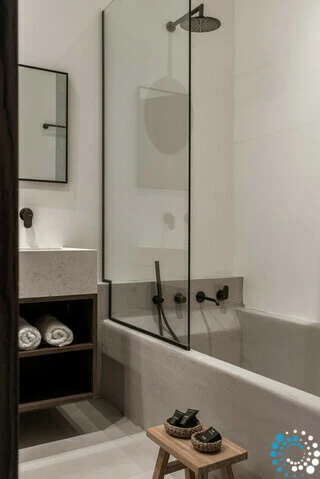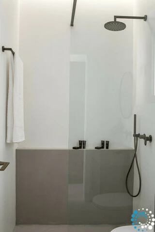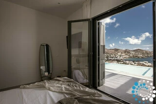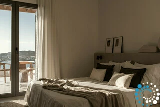 La villa comprend quatre élégantes chambres avec lits queen size, chacune offrant une vue apaisante sur la baie et équipée de volets en bois traditionnels et de la climatisation pour un confort toute l’année. Les espaces nuit sont complétés par deux salles de bain attenantes avec douches modernes, une grande salle de bain familiale avec baignoire et doubles vasques, ainsi qu’un WC séparé supplémentaire. Sur demande, les familles peuvent également profiter de touches attentionnées comme une tente pour enfant et un lit bébé.
