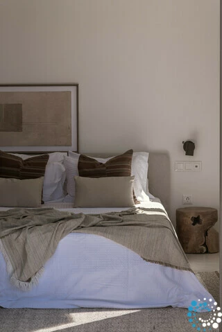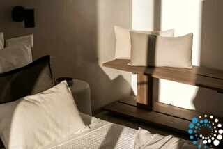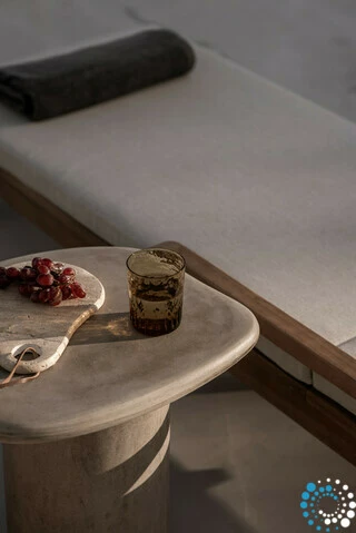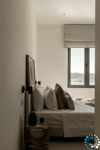 À la tombée de la nuit, la villa devient un sanctuaire paisible. Même lors des soirées plus fraîches, les invités peuvent s’installer dans le salon en contrebas près de la piscine, réchauffé par la lueur d’une cheminée électrique, tandis que le ciel devient bleu profond et que les étoiles apparaissent au-dessus de la baie. Un verre de vin local de Syros complète cette atmosphère de vie insulaire sans effort.