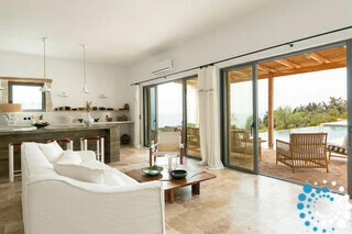 La maison principale vous accueille avec un espace de vie ouvert et lumineux où la cuisine avec bar s’intègre harmonieusement à un vaste salon, tous deux s’ouvrant sur une terrasse qui laisse entrer la brise marine. Un coin lecture chaleureux offre un espace de calme, tandis qu’une cave à vin et des toilettes invités ajoutent confort et charme au rez-de-chaussée. À l’étage, la chambre principale dispose d’un lit king-size, d’une salle de douche en suite et d’un accès direct à une grande terrasse donnant sur la mer, idéale pour des matinées tranquilles ou des couchers de soleil.
