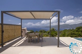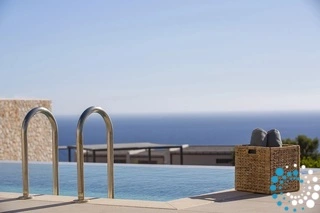 À l’extérieur, vous découvrirez une véritable oasis privée. Une piscine scintillante occupe le centre de la terrasse ensoleillée, entourée de transats confortables et de parasols — l’endroit parfait pour profiter du soleil grec. L’espace repas et salon extérieur ombragé invite à savourer de longs petits-déjeuners, des après-midis tranquilles ou des dîners romantiques sous le ciel étoilé, tandis que le jardin paysager crée une atmosphère paisible et intime.