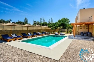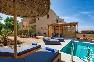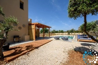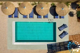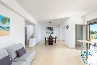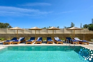 À l’extérieur, la piscine privée est entourée de transats où les hôtes peuvent profiter du soleil méditerranéen. L’espace extérieur est paisible et serein, offrant une vue imprenable sur la mer et un jardin soigneusement entretenu. Un espace barbecue et un coin salon ombragé sous une pergola invitent à partager des moments mémorables en famille ou entre amis dans un cadre idyllique.