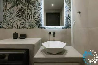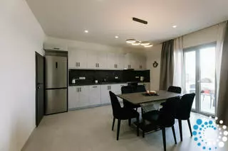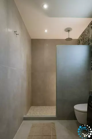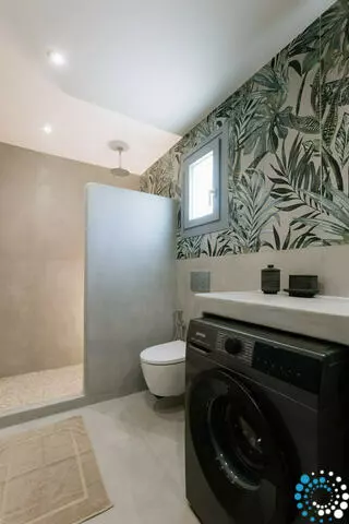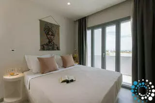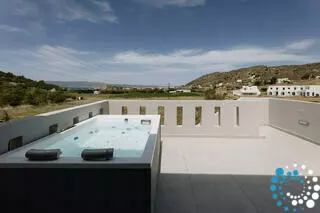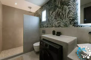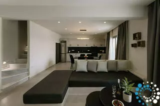 La villa propose trois chambres, un salon lumineux ouvert avec Smart TV et une cuisine entièrement équipée avec coin repas, lave-vaisselle et machine Nespresso. Le rez-de-chaussée comprend une chambre et une salle de bain, tandis que l’étage supérieur abrite deux chambres principales avec salle de bain privative et balcon — l’une dispose même d’un jacuzzi avec vue sur la mer au loin.