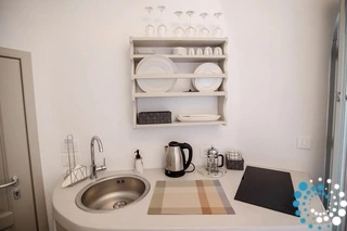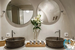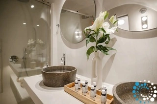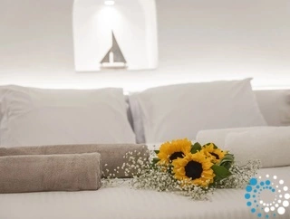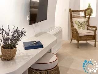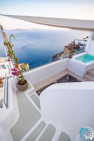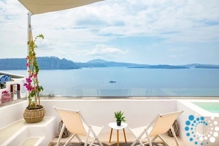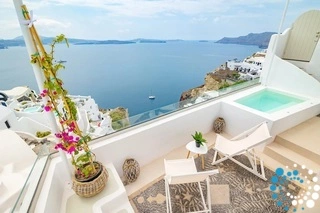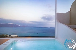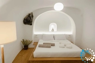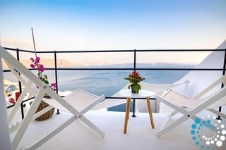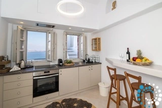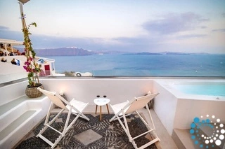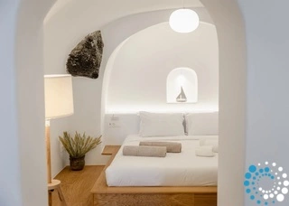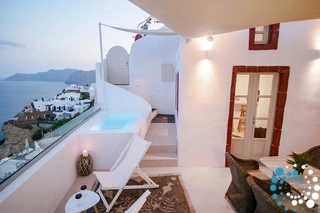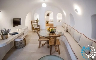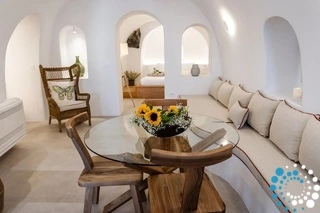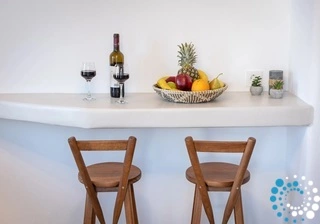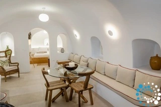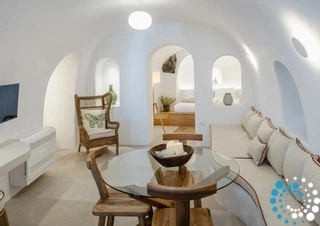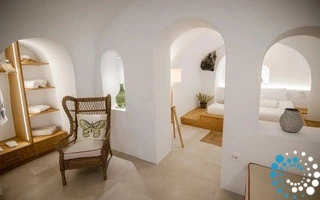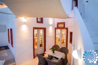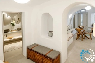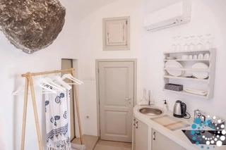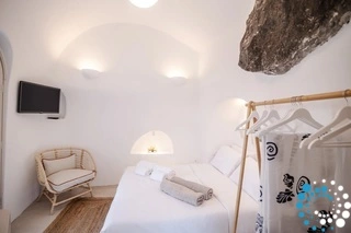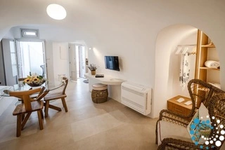 Répartie sur deux niveaux, reliés par un escalier extérieur, cette suite élégante et entièrement équipée est en parfaite harmonie avec l’architecture unique d’Oia et peut accueillir confortablement jusqu’à 3 personnes. L’étage supérieur comprend un lit double Queen size, une salle de bain avec douche, ainsi qu’une kitchenette avec réfrigérateur et équipements pour le thé et le café. La petite véranda meublée est idéale pour se détendre en admirant le magnifique paysage marin.