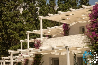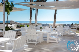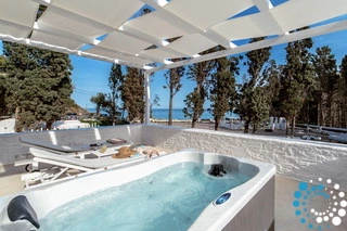 À l’extérieur, une terrasse privée avec coin repas s’ouvre sur le jardin et la présence apaisante de la plage toute proche, idéale pour des matins tranquilles et des soirées au coucher du soleil. L’expérience est encore sublimée par la véranda à l’étage, où un jacuzzi privé vous attend, offrant un lieu privilégié pour se détendre tout en admirant les vastes panoramas sur la mer Égée.