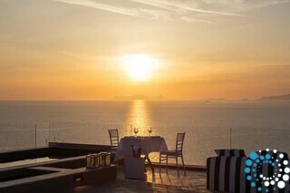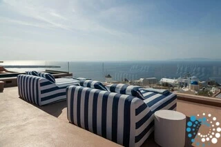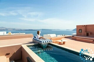 Le toit offre l’ultime expérience de Santorin. En tant que plus haut toit d’Oia, il offre une vue panoramique ininterrompue sur l’île. Une grande piscine invite à se rafraîchir tout en admirant le paysage, et le coin lounge soigneusement aménagé, comprenant des lits de soleil extra-larges, un canapé lounge et un mini-bar, crée un espace idyllique pour se détendre ou savourer un cocktail au coucher du soleil. Pour ceux qui recherchent un dîner romantique ou privé, une table peut être dressée sous les étoiles, ajoutant une touche magique à vos soirées.