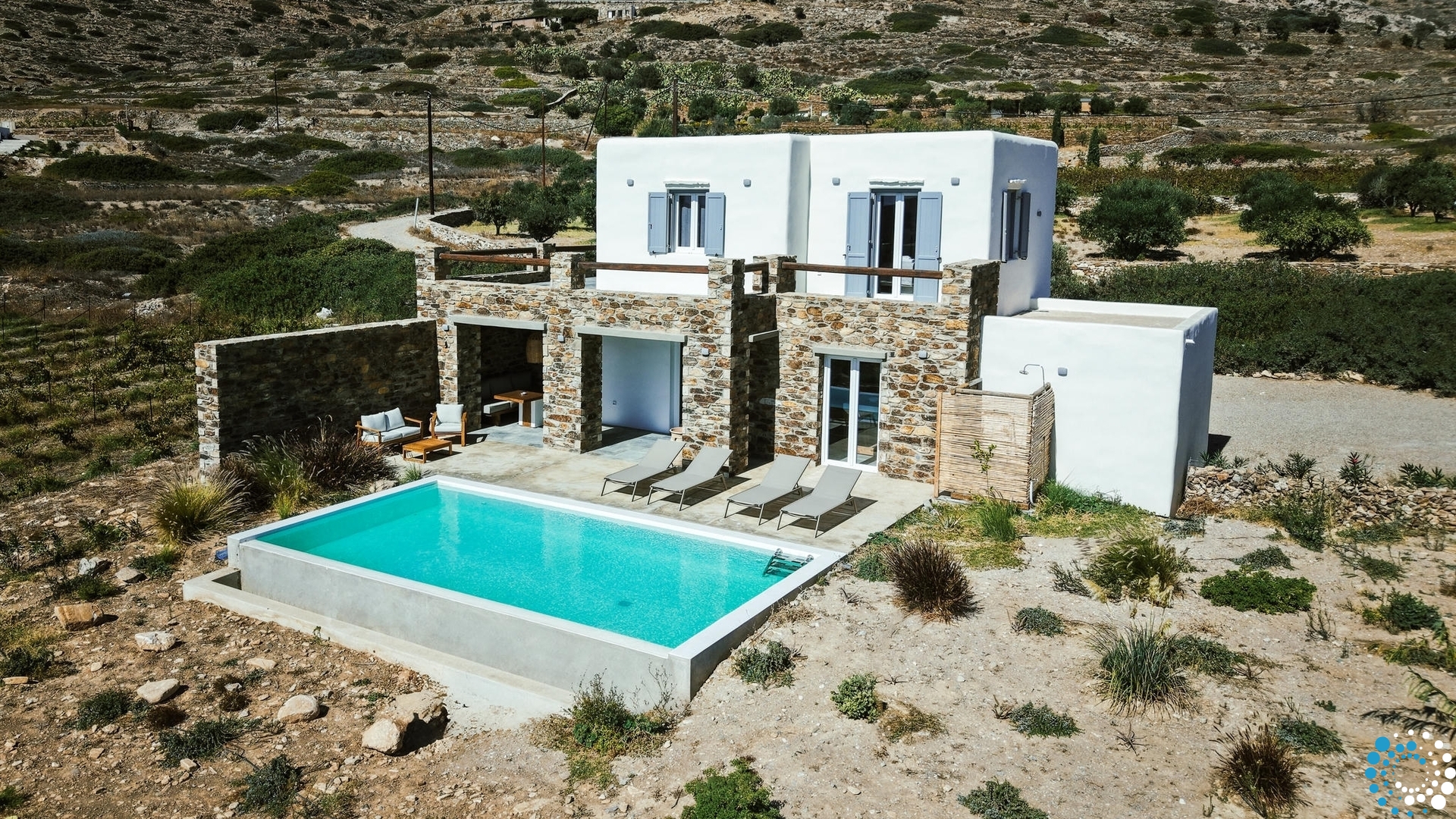 Située juste au-dessus du port d’Ios et de la plage de Yialos, la propriété se trouve à environ 15 à 20 minutes de marche. Les ruelles pleines de charme d’Ios Chora—abritant boutiques, tavernes authentiques et une vie nocturne animée—sont également facilement accessibles à pied ou en quelques minutes en voiture. Les voyageurs désireux d’explorer davantage l’île pourront rejoindre sans difficulté des sites remarquables tels que le Tombeau d’Homère et le Monastère d’Agios Ioannis.