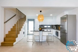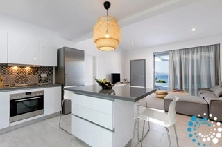 La cuisine entièrement équipée dispose d’appareils modernes et de grandes portes-fenêtres laissant entrer la lumière naturelle. À côté de la cuisine, le spacieux salon vous invite à vous détendre confortablement tout en profitant de la vue sur la terrasse et la piscine, ou à vous relaxer le soir sur le canapé moelleux devant la télévision par satellite de 40''.