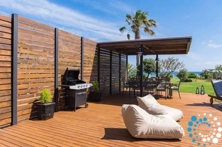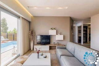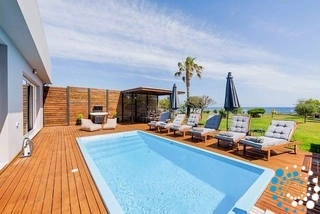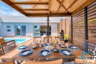 La cuisine ouverte est entièrement équipée pour la préparation de tous les repas, tandis que le salon confortable, décoré dans des tons apaisants de gris et de sable, offre un espace relaxant pour se détendre. La villa dispose également d’une télévision connectée et d’une connexion Wi-Fi gratuite dans tout l’établissement, d’une piscine privée de rêve avec des transats et d’un espace barbecue avec coin repas pour profiter de moments conviviaux à l’extérieur.