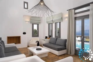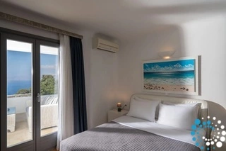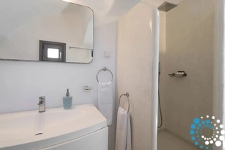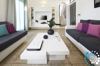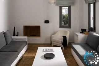 L’architecture cycladique de la villa et son style élégant, agrémenté d’une touche de modernité, laisseront une impression durable. L’espace intérieur est réparti sur trois niveaux, avec le salon occupant le rez-de-chaussée. Les trois chambres spacieuses et les salles de bains se trouvent au premier étage, au rez-de-chaussée et au niveau semi-enterré. Une palette de couleurs terreuses domine dans tous les espaces, mêlée à des touches artistiques sur les murs qui confèrent à l’ensemble une atmosphère de sophistication et de style.