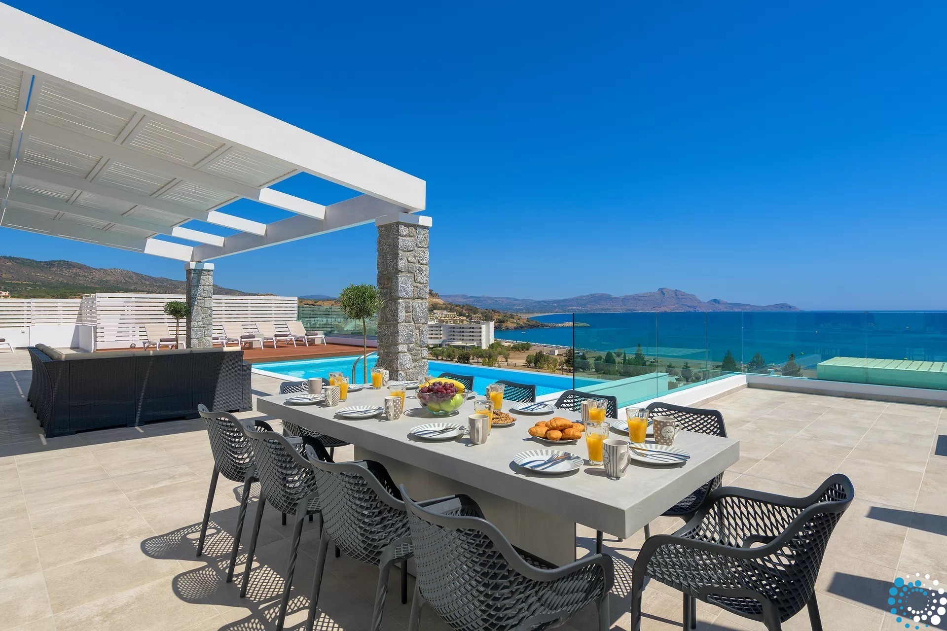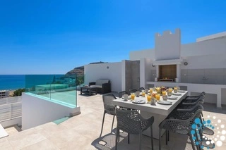 À l’extérieur, la terrasse principale invite à se prélasser sur les transats, à prendre des repas à la grande table à manger et à admirer les vues magnifiques. La piscine de 8x5 mètres offre un refuge rafraîchissant, tandis que le barbecue intégré et la douche extérieure complètent l’expérience de vacances ultime.