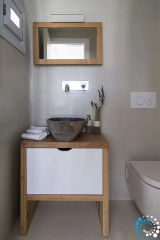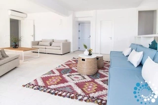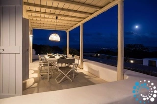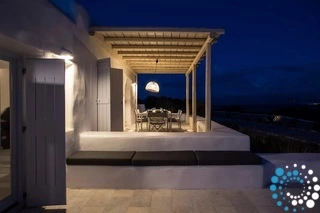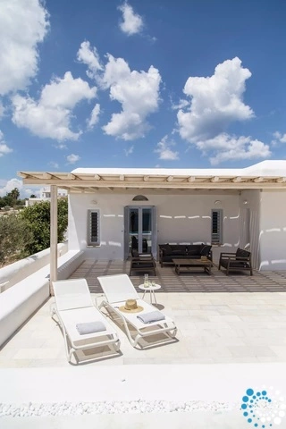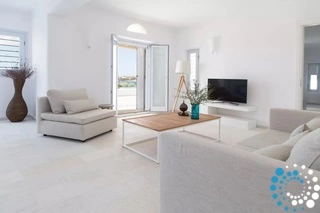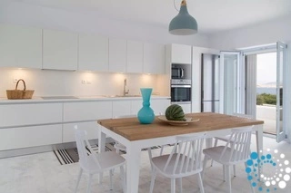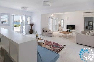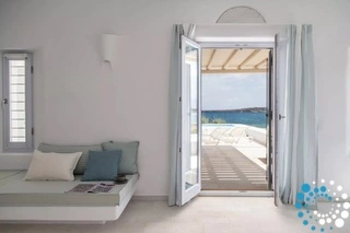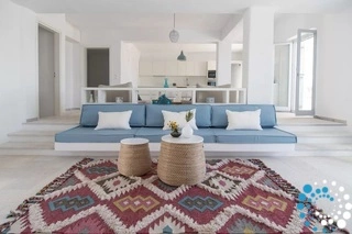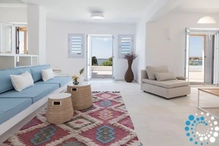 La villa comprend deux chambres spacieuses, une grande salle de bains, un WC invité, un salon ouvert et lumineux, ainsi qu’une cuisine entièrement équipée avec coin repas. Inondés de lumière naturelle, les intérieurs s’ouvrent sur une véranda ombragée avec vue sur la mer Égée.