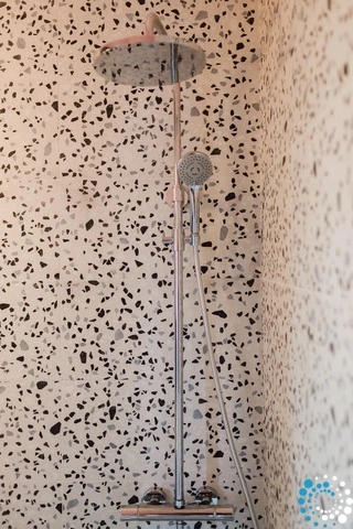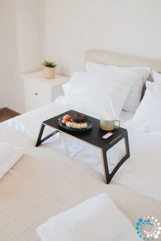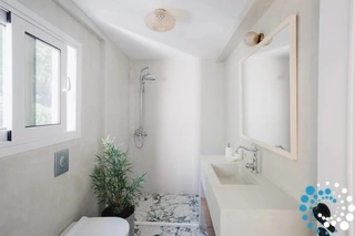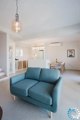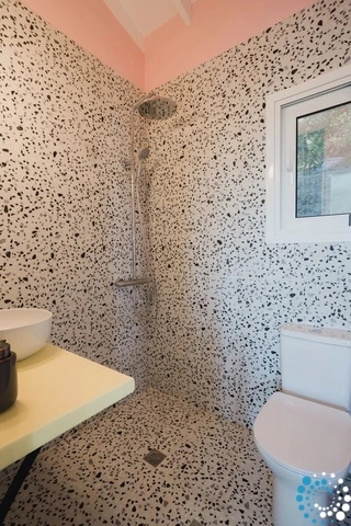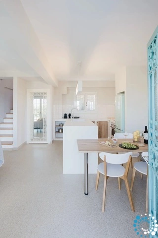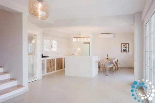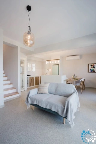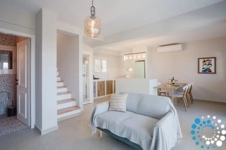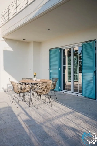 À votre arrivée, vous découvrirez un espace ouvert combinant cuisine et salon. Une porte vitrée mène à la terrasse, où vous pourrez vous détendre et profiter de la vue sur le jardin, la piscine et le coucher de soleil. Une première salle de bain avec WC en suite se trouve à cet étage. À l’étage, deux chambres vous attendent : une avec un lit double et une avec deux lits simples pouvant être transformés en un grand lit double, accessibles par quelques marches. Chaque chambre dispose de son propre balcon offrant une vue sur la mer et de magnifiques couchers de soleil. La deuxième salle de bain avec WC en suite se trouve juste à côté des chambres.