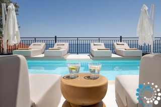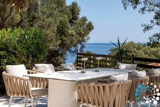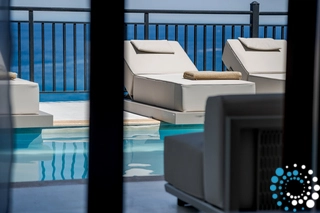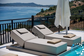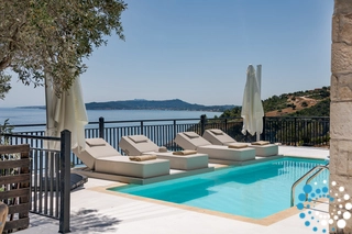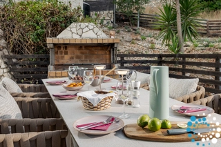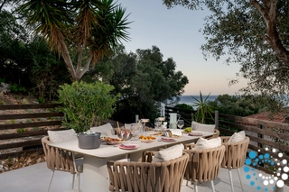 La vie en extérieur est au cœur de l’expérience Villa Theia. La vaste terrasse est pensée pour la détente comme pour le partage, avec une piscine privée surplombant la mer, des transats, des parasols et une douche extérieure pour un confort optimal tout au long de la journée. Un espace repas ombragé sous la pergola et un barbecue en pierre intégré invitent à de longs repas en plein air, à savourer en famille ou entre amis.