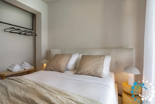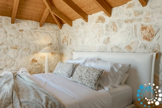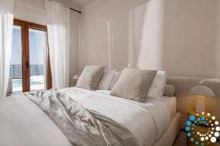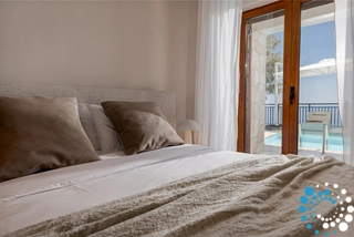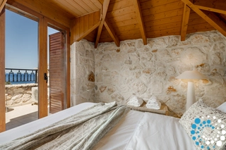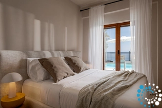 Le dernier étage est entièrement dédié à la suite principale, offrant intimité absolue et vues spectaculaires en hauteur. La chambre dispose d’un lit king-size, d’une salle de bains privative et d’un accès à une terrasse exclusive. De là, la vue s’étend de la plage de Xygia jusqu’au littoral nord de Zakynthos, un cadre parfait pour un café au lever du soleil ou un verre au crépuscule.