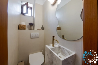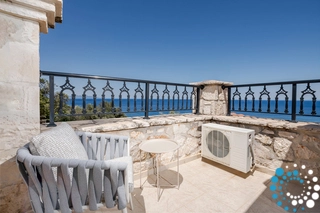 Au premier étage se trouve le salon et la salle à manger baignés de lumière, où de larges ouvertures encadrent des vues imprenables et ininterrompues sur la mer. Cet espace se prolonge naturellement vers une cuisine design entièrement équipée d’appareils haut de gamme, idéale pour cuisiner en toute simplicité. Un WC invités aux finitions soignées se trouve également à ce niveau.