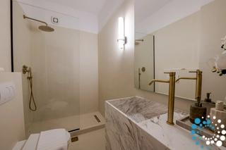 Le rez-de-chaussée abrite deux chambres spacieuses, chacune équipée d’un luxueux lit king-size habillé de linge de grande qualité. Les deux chambres offrent un accès direct à la terrasse de la piscine et bénéficient d’une vue mer totalement dégagée. Une élégante salle de bains avec finitions en marbre et douche à effet pluie complète ce niveau, créant une atmosphère digne d’un spa.