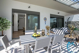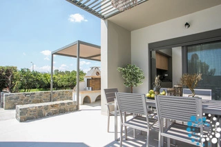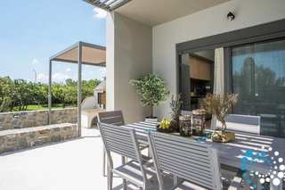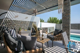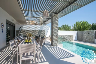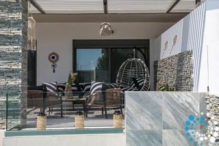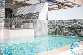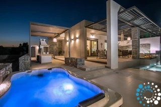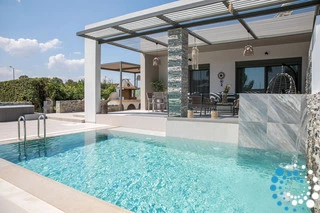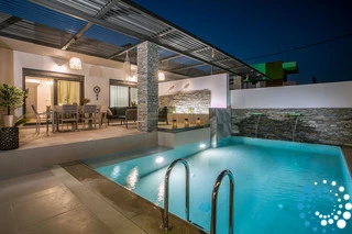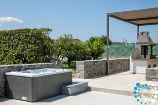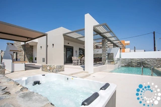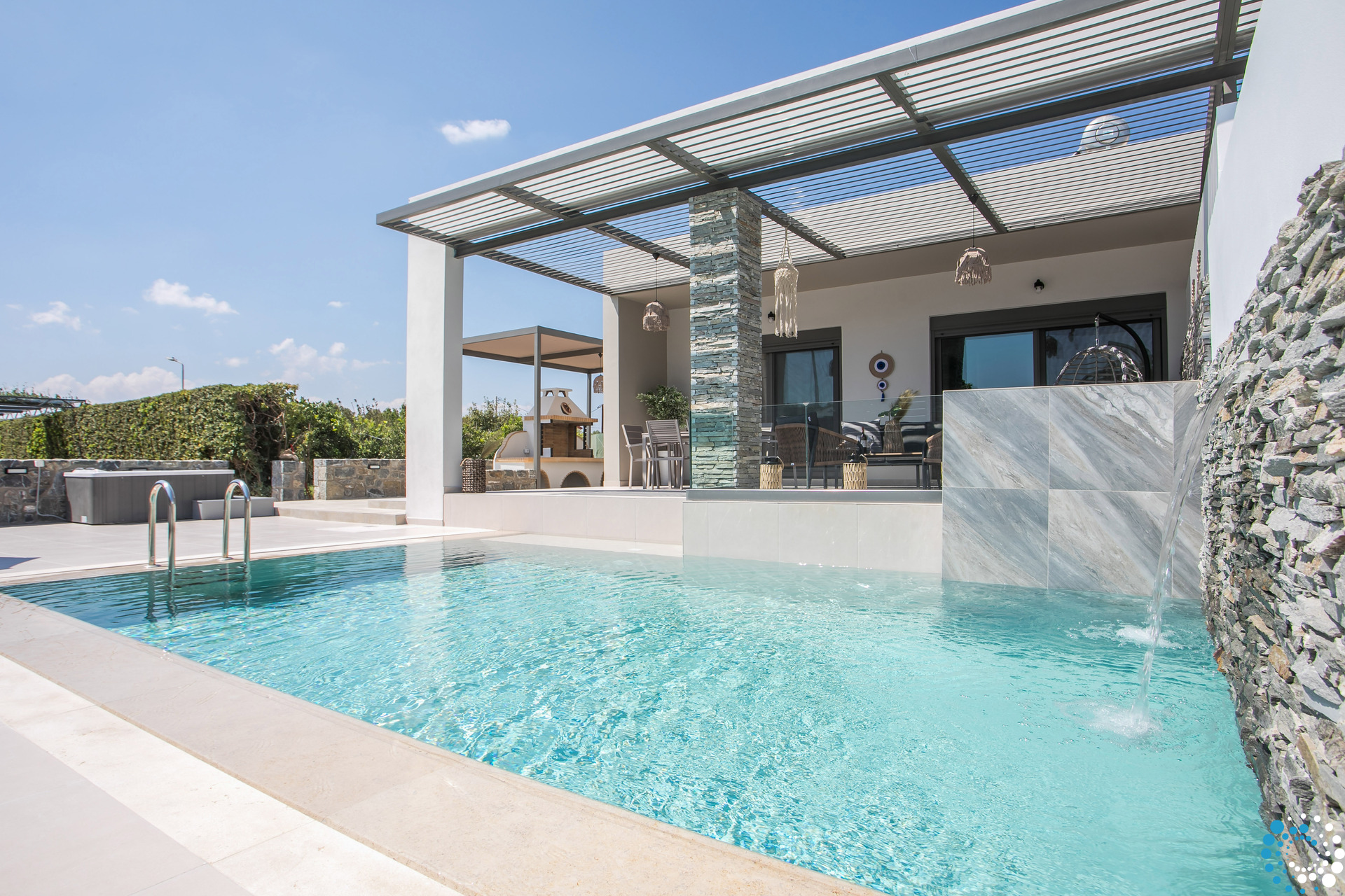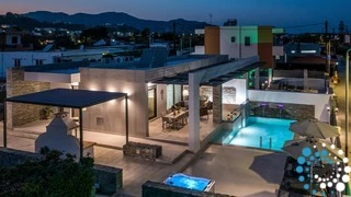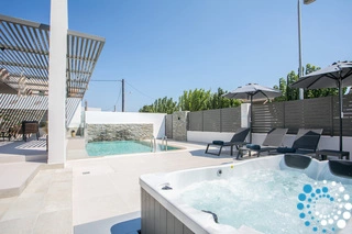 À l’extérieur, une grande piscine privée entourée de transats et de parasols vous invite à la détente, tandis que le jacuzzi adjacent promet des moments de luxe absolu. L'espace extérieur comprend également un coin repas avec barbecue et un salon extérieur confortable pour profiter de soirées conviviales. Pour plus de confort, une salle de bain extérieure avec douche permet de passer facilement des moments de baignade à la relaxation.