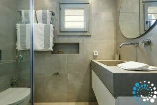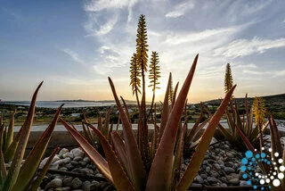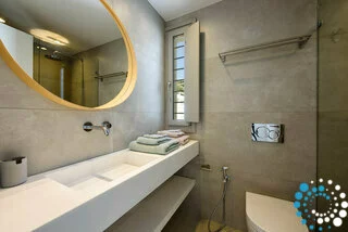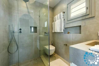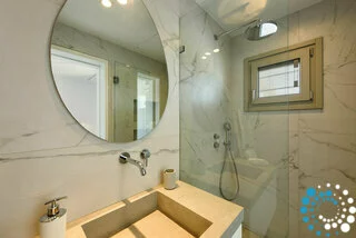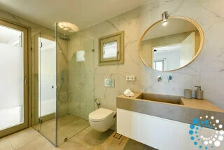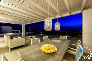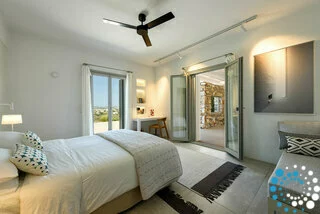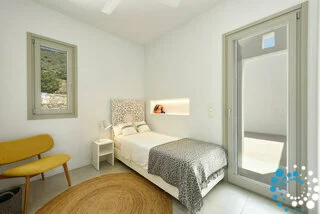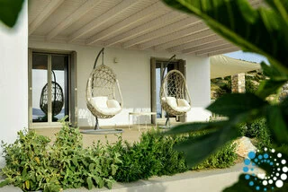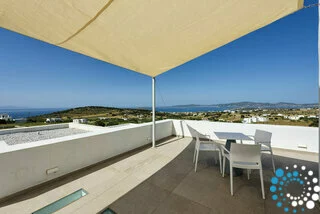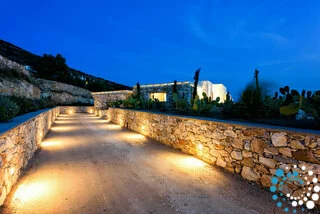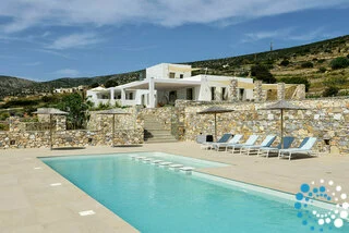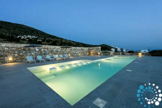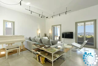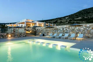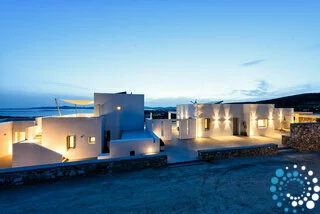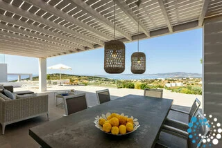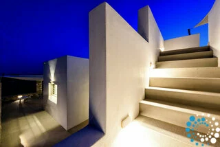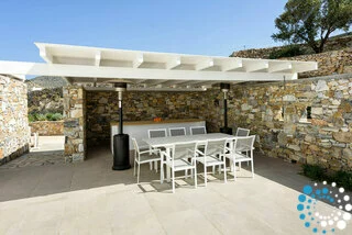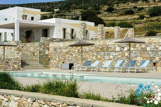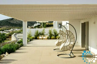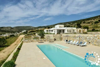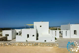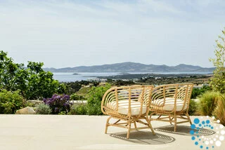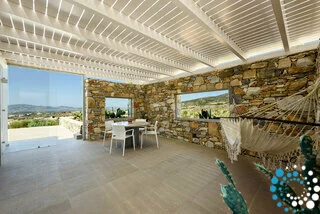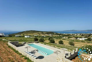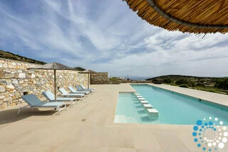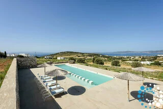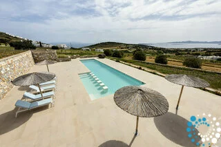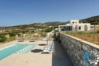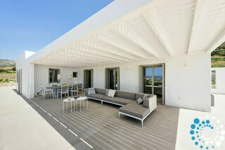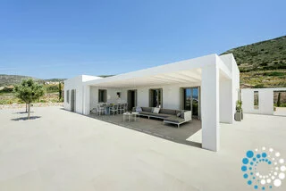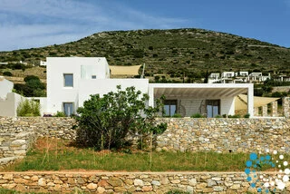 La propriété se compose de deux unités reliées entre elles, avec un vaste espace piscine distinct orienté vers la mer Égée. Les extérieurs sont soigneusement paysagés et entretenus, tandis que la décoration intérieure est moderne, élégante et artistique. Les façades avant offrent des vues dégagées sur la mer et le ciel, tandis que les terrasses arrière s’ouvrent sur un paysage vallonné composé d’oliveraies, de vignobles, de murs en pierre anciens et de végétation locale. Une allée mène aux entrées principales situées côté colline. Les deux unités voisines sont reliées par de larges terrasses et des cheminements.