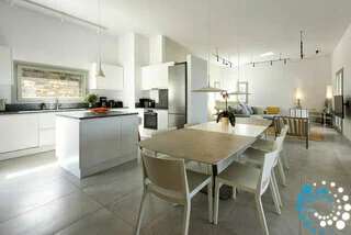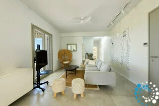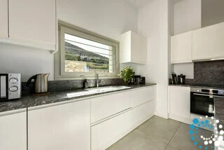 L’unité 2 attenante propose un grand espace de vie ouvert avec cuisine et salle à manger. Un couloir donne accès à deux chambres doubles avec vue sur la mer et à une chambre simple avec vue sur la montagne, toutes équipées de salles de bains privatives. La terrasse sud est ombragée par une structure en voiles et s’ouvre sur un vignoble, constituant un cadre idéal pour les repas.