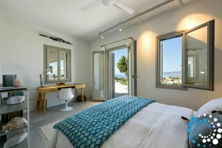Dans l’unité 1, l’entrée s’ouvre sur un vaste salon avec salle à manger et cuisine ouverte. Un couloir mène aux chambres, comprenant une suite parentale avec pergola privée protégée et une seconde chambre double, toutes deux dotées de salles de bains privatives. Ces chambres bénéficient d’un accès direct à la terrasse avant avec vue sur la mer. La pergola frontale de l’unité 1 dispose d’une table en pierre pour les repas en extérieur et d’un espace salon offrant une vue paisible et dominante sur la mer, le moulin du village et la petite église d’Agios Giorgos.