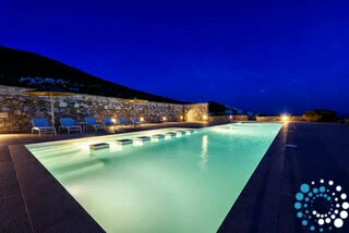 La piscine, d’une longueur de 18 mètres sur 4 mètres de large, est idéale pour la nage et comprend également une zone peu profonde adaptée aux enfants. L’espace piscine et sa grande terrasse sont légèrement en contrebas et à l’écart, créant un espace dédié à la détente. Une pergola récemment installée près de la piscine abrite une cuisine extérieure équipée d’une plancha.