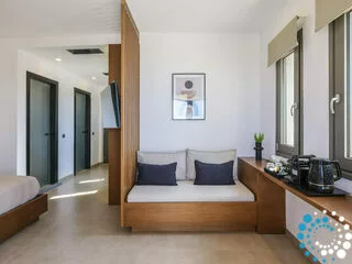 Montez sur votre terrasse privée et admirez une vue imprenable sur la mer, ainsi qu’une agréable vue sur votre propre piscine à débordement. Équipé d’un mobilier d’extérieur élégant, cet espace est parfait pour se détendre, profiter du soleil ou savourer des moments paisibles au milieu de la beauté naturelle. Cette suite constitue un refuge sophistiqué et intime pour un séjour inoubliable.