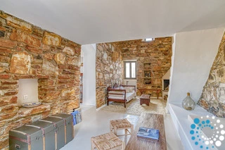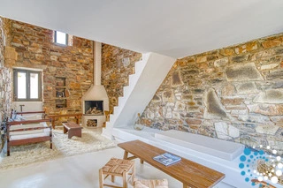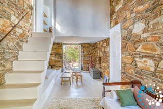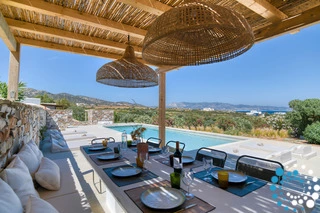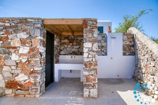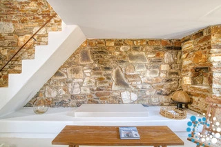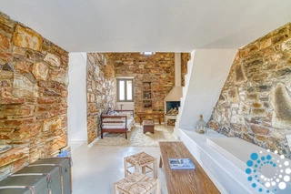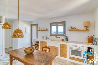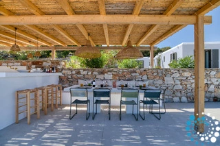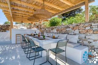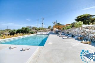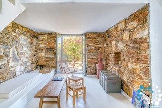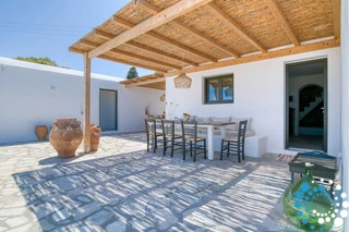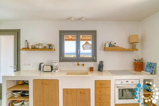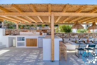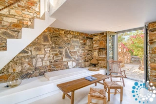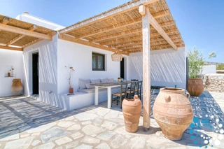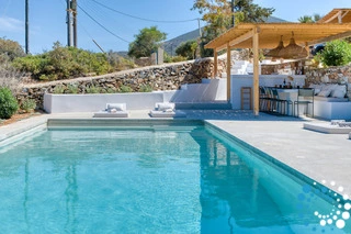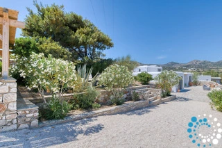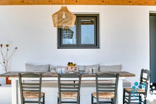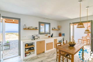 L’architecture, rappelant de parfaits cubes blancs, crée des intérieurs chaleureux et de nombreux recoins paisibles propices à la détente. Un majestueux pin domine la partie supérieure de l’espace extérieur, apportant ombre naturelle et caractère. Quelques marches plus bas, une vaste zone avec piscine et barbecue offre des espaces ensoleillés et ombragés—idéale pour des repas conviviaux, des moments de détente ou simplement pour admirer les vues sur la mer Égée méridionale.