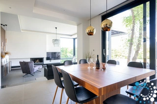 À l’extérieur, les invités peuvent profiter de la piscine privée de 32 m² avec transats, d’un salon extérieur moderne, d’un espace repas ombragé et d’un barbecue, idéal pour se détendre au soleil ou dîner en plein air. Le jardin luxuriant garantit une intimité totale et offre une vue magnifique sur la nature environnante.