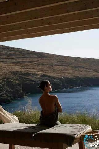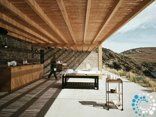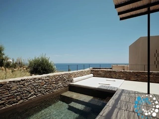 Warme tinten beige, zand en crème geven het interieur een kalmerende sfeer, terwijl steen- en houtafwerkingen, zachte stoffen en handgemaakte keramiek de plaatselijke schoonheid van het eiland weerspiegelen. Een lichte en luchtige open woon- en slaapruimte wordt aangevuld met een ruime badkamer waar intimiteit, ontspanning en verjonging samenkomen. De veranda’s met uitzicht op zee en tuin bieden volop buitenruimte om te genieten van de Egeïsche bries, buiten te dineren of weg te dromen in de zon bij je eigen privézwembad.