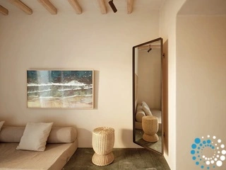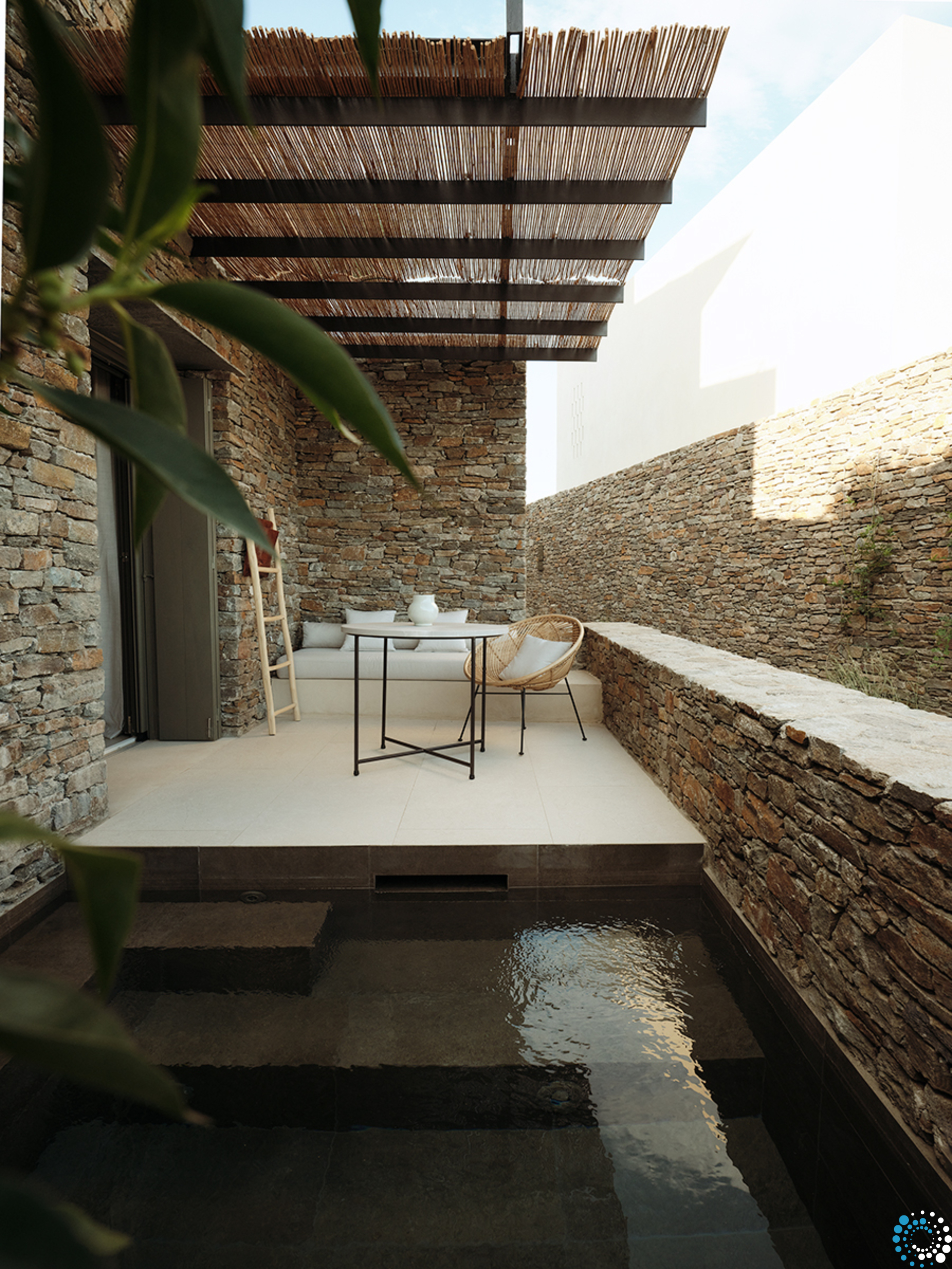 Het hotel is ontworpen om intimiteit, rust en elegantie te combineren en is een vredig toevluchtsoord dat de traditionele schoonheid en ambacht van het eiland weerspiegelt. Interieurs openen zich naar besloten binnenplaatsen, terrassen en balkons, waardoor moeiteloos binnen/buitenleven ontstaat. Natuurlijke materialen, aardse texturen en handgemaakte details vormen een minimalistische maar verfijnde esthetiek, versterkt door moderne gemakken voor een ontspannen, rustgevende sfeer die meteen als thuis aanvoelt.