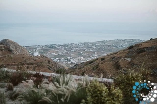 Een smalle weg slingert omhoog vanaf de kust en onthult dramatische vergezichten over de Egeïsche Zee richting Kreta; het voelt heerlijk afgelegen. In werkelijkheid ligt het slechts ongeveer 2 km van Perivolos, een van de fijnste zwarte zandstranden van het eiland, en ongeveer een halve kilometer van de winkels en taverna’s van het traditionele dorp Pyrgos. Oia’s levendige straatjes en iconische zonsondergangen liggen verder naar het noorden, op ongeveer 19 km afstand.